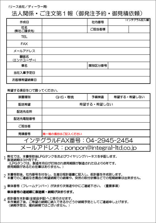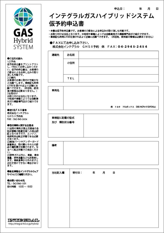 - 初めに、お電話または下記仮予約申込書をFAXしてください。お客様のお車に取付け可能かお調べします。